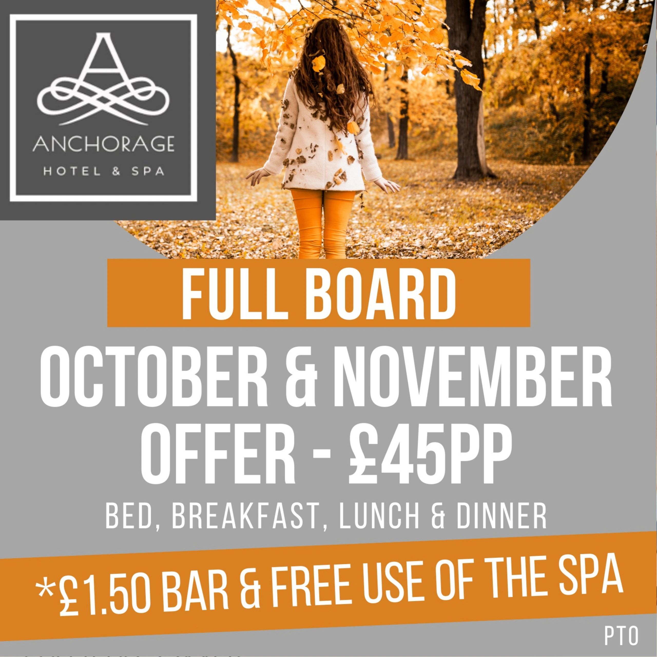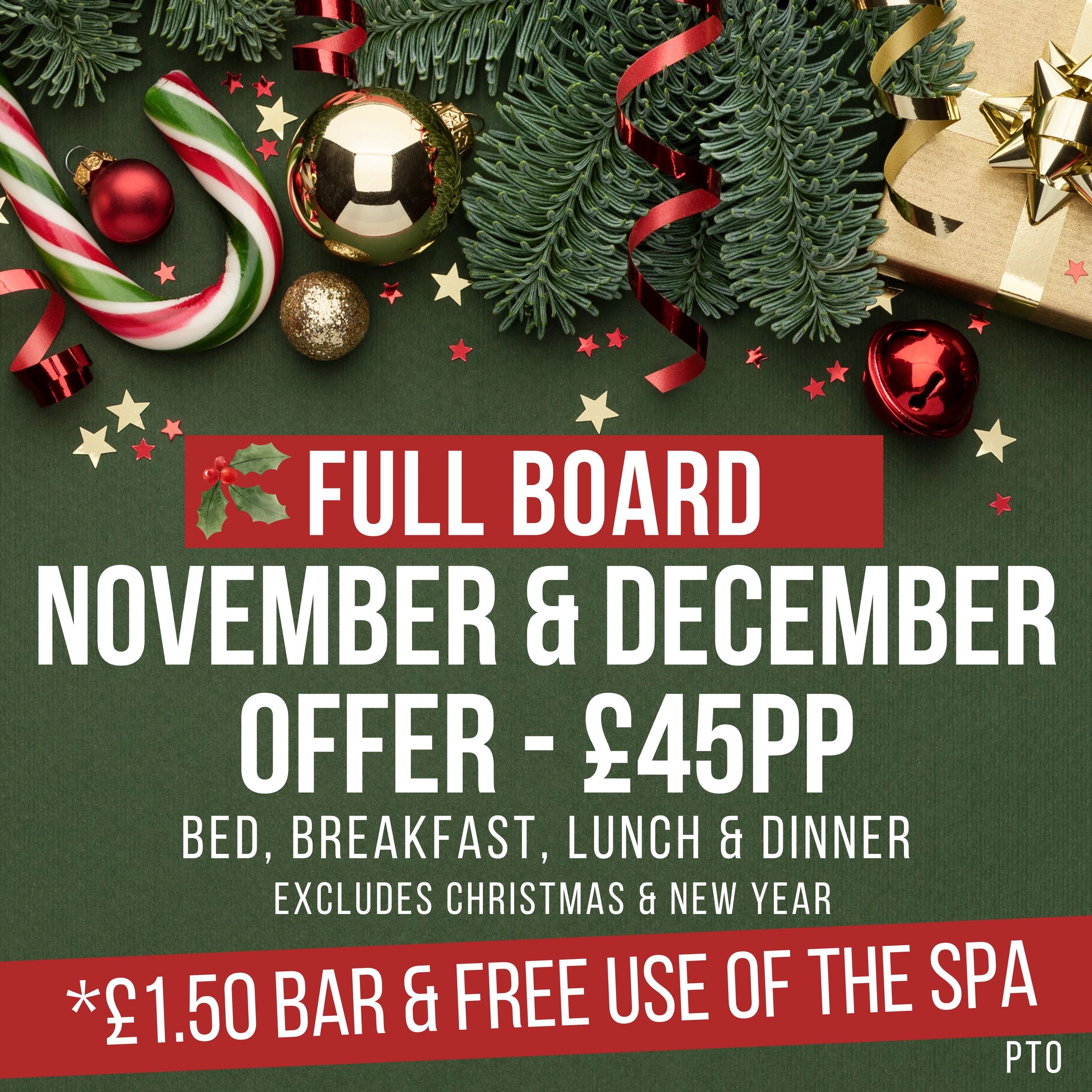 Book a Full Board Break for only £45 per person, per night. Includes Breakfast, Lunch and Dinner with a £1.50 bar on selected drinks and Full FREE access to the Spa.